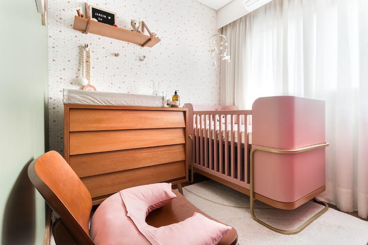 Quarto de bebê combinando madeira e cor-de-rosa