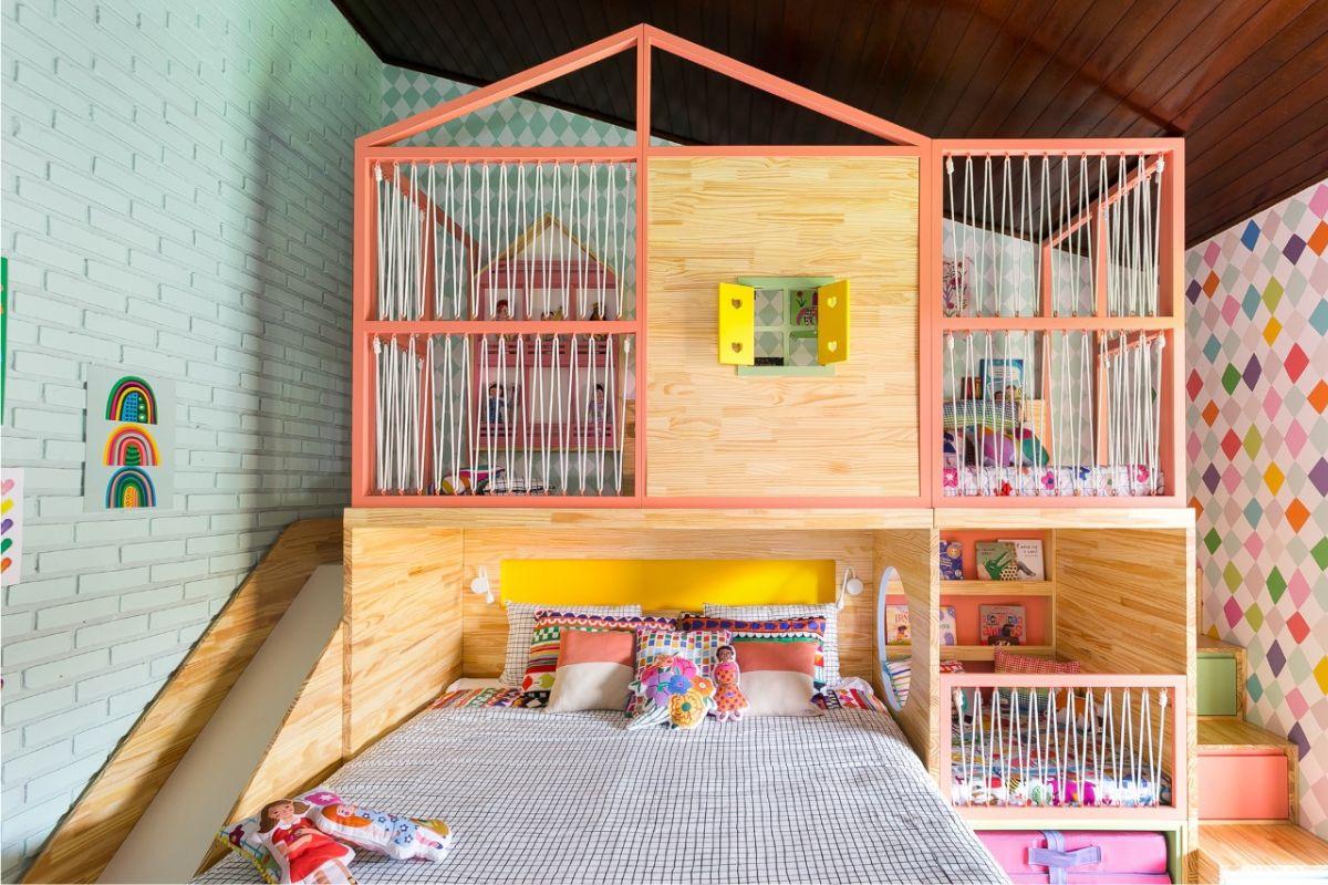 A influenciadora Taciele Alcolea pediu um quarto alegre e colorido, com cara de casa de campo, para o sítio dela. O principal desafio da Uebaa Design foi montar um espaço com essas características que acolhesse, no mesmo ambiente, a cama do casal, da filha mais velha e o berço da bebê. Para isso, foi usada uma cama king e uma cama de solteiro acima dela, onde foi criado um mezanino. O berço fica imediatamente ao lado dos pais, com uma passagem circular para pegar a menina quando necessário.