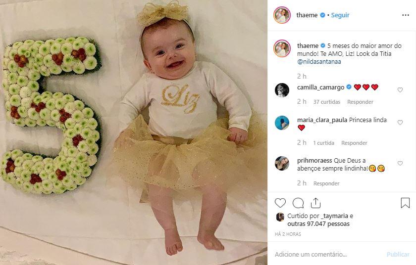 “5 meses do maior amor do mundo!”, declarou Thaeme na legenda da publicação. “Te amo, Liz!”. Nos comentários, os seguidores deixaram muitos elogios e deram os parabéns para Liz por mais um mês de vida.