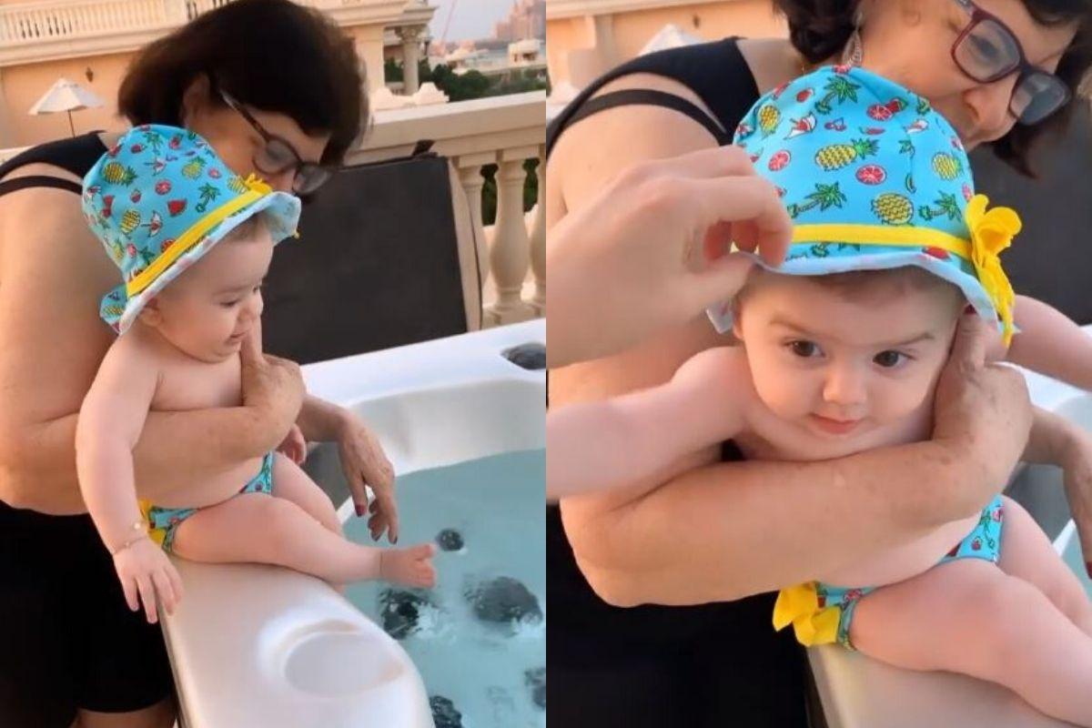 No vídeo, Liz está supercharmosa usando um biquíni e um chapéu de frutas. “Quem vai entrar na água?”, pergunta Thaeme enquanto a menina dá risada e se diverte colocando os pés na piscina.