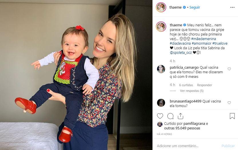 Thaeme divertiu os seguidores ao publicar uma foto de Liz após tomar vacina. Na segunda-feira, 9 de dezembro, a cantora sertaneja foi ao Instagram para contar aos fãs que Liz tomou vacina e não chorou pela primeira vez!