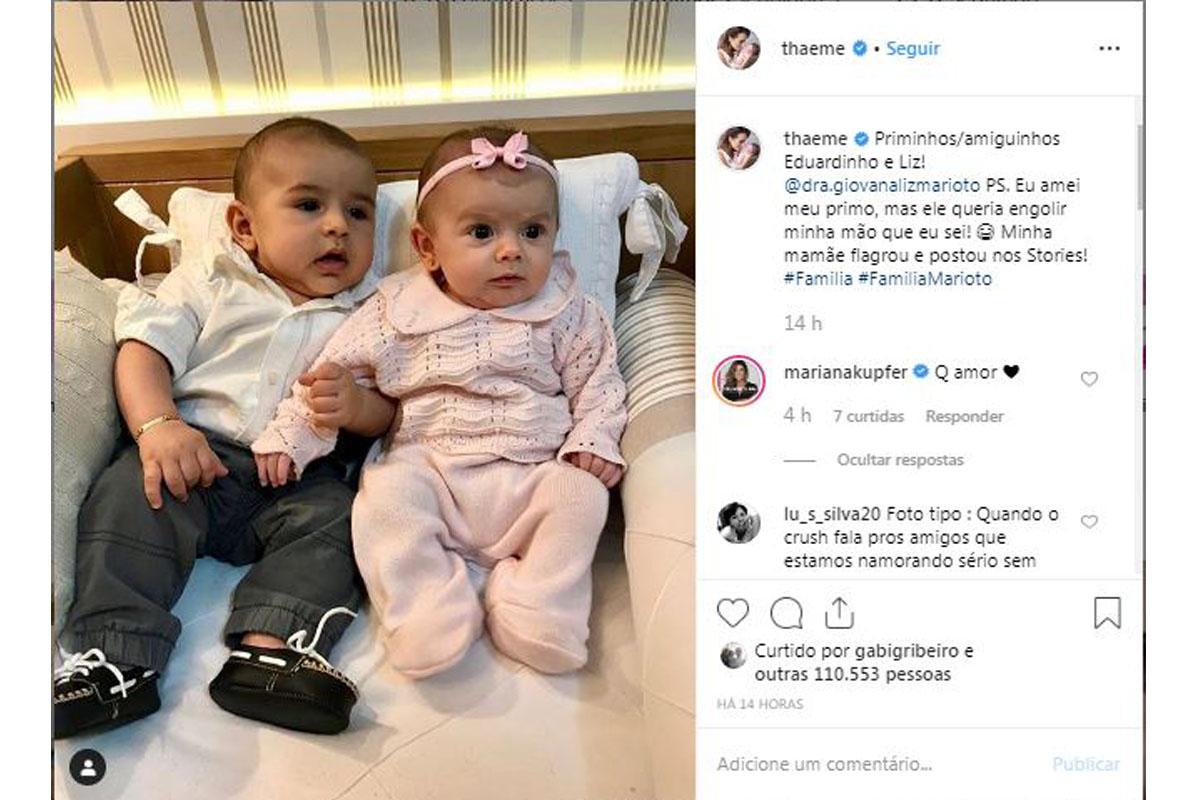 Thaeme ainda disse, como se fosse a bebê: “Eu amei meu primo, mas ele queria engolir minha mão que eu sei! Minha mamãe flagrou e postou nos Stories”. Os seguidores se divertiram com o clique. “Foto tipo: Quando o crush fala pros amigos que estamos namorando sério sem eu saber!”, comentou uma.
