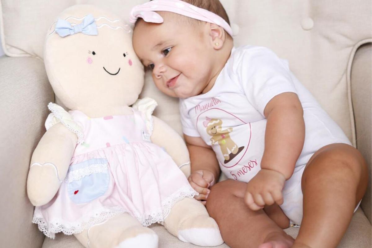 Ticiane, que também é mãe de Rafaella, de 10 anos, compartilhou uma foto da bebê, que vestia um body escrito “Manuella, 5 meses” ao lado de uma pelúcia.