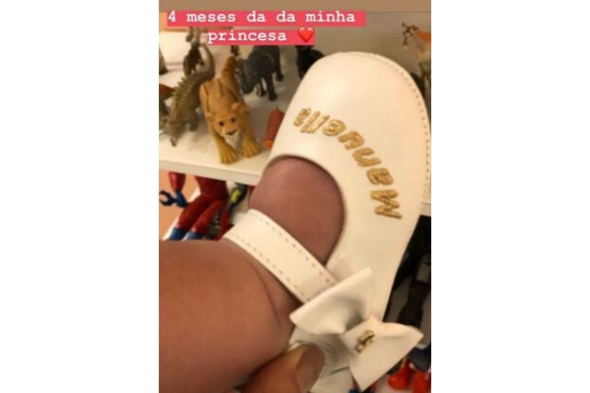 “4 meses da minha princesa”, declarou Ticiane, mostrando um pequeno sapato branco com lacinhos e o nome “Manuella” escrito em dourado. A menina de 4 meses é fruto do casamento da apresentadora com o jornalista César Tralli. Além de Manuella, Ticiane Pinheiro também é mãe de Rafaella Justus, de 10 anos. Rafa é filha de Tici com o empresário Roberto Justus.