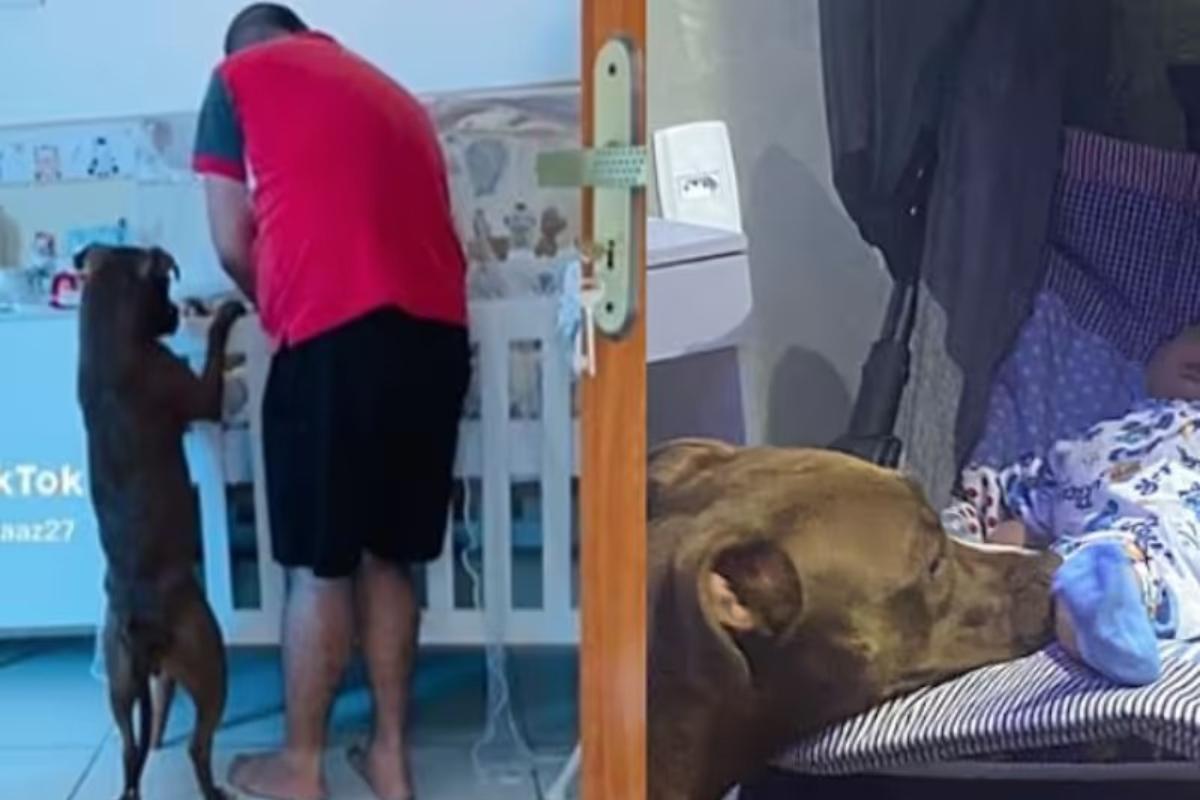 No registro, o animal aparece “em pé” ao lado do tutor, André William, enquanto o pai cuida e acalma a criança que chora. A gravação foi feita pela dona, Esther Silveira, e já bateu 5,3 milhões de visualizações no Tiktok.