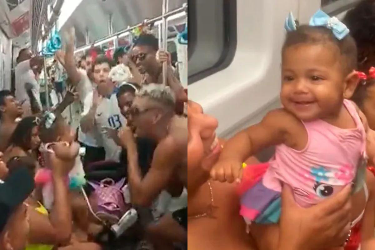 Momento em que os foliões cantavam para a bebê no vagão do metrô (Foto: Reprodução/Twitter)