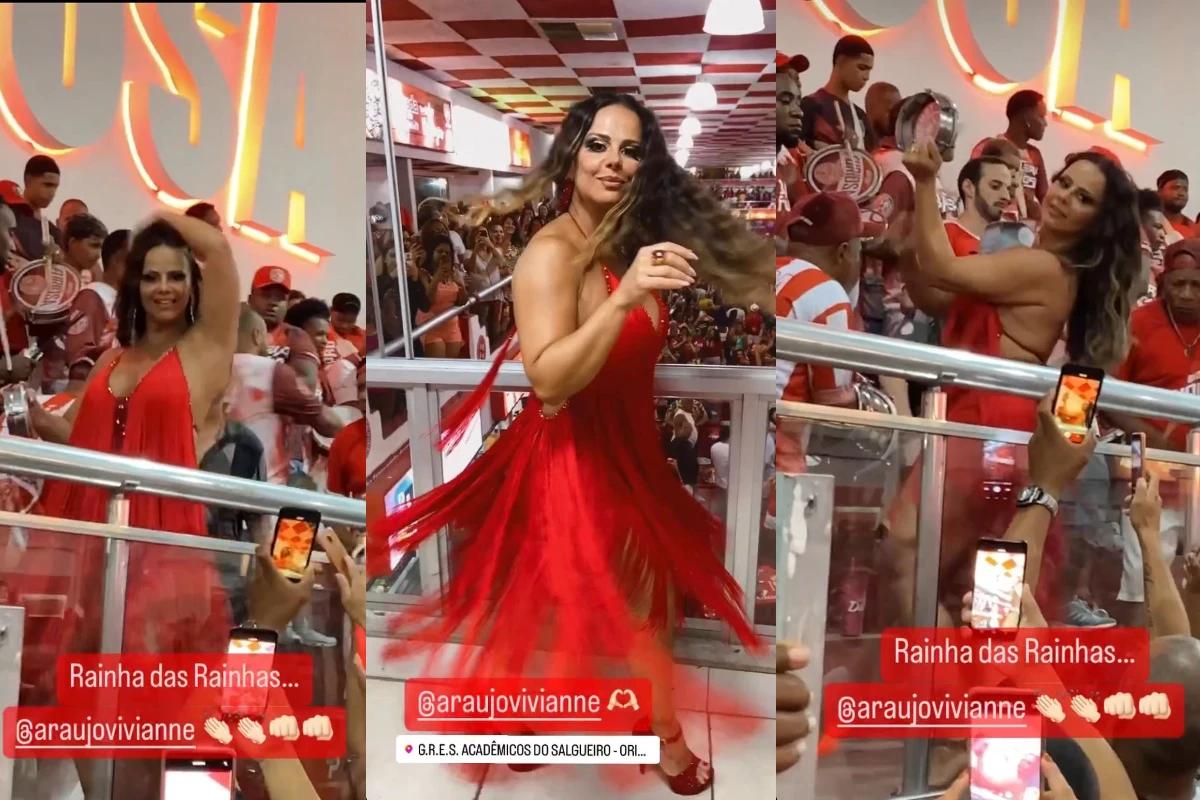 Viviane deu à luz o primeiro filho Joaquim recentemente, mas isso não a impediu de escolher um look vermelho com franjas para sambar muito no ensaio do Salgueiro no último dia 28 de janeiro.