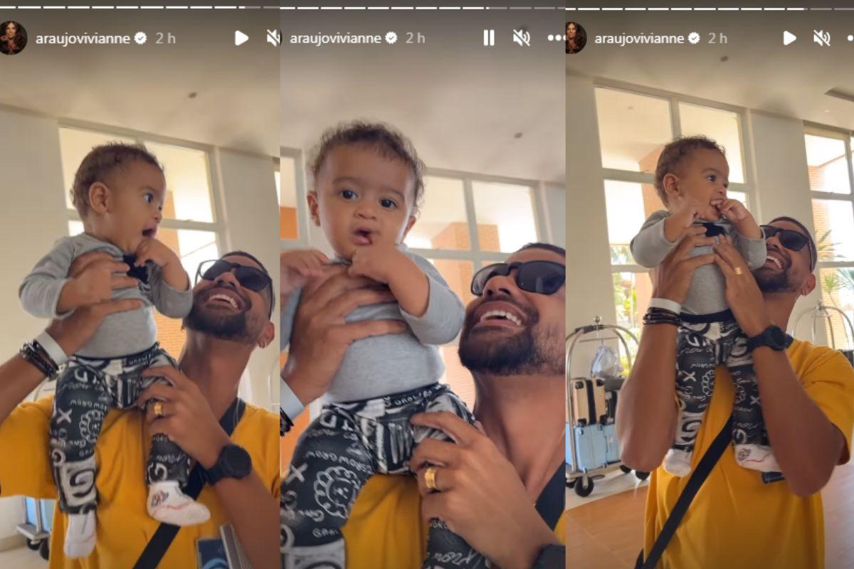 Chegando em Fortaleza, Viviane compartilhou os primeiros momentos do bebê brincando com o pai. “Quem é o mais animado do rolê”, diz ela enquanto o filho se diverte.