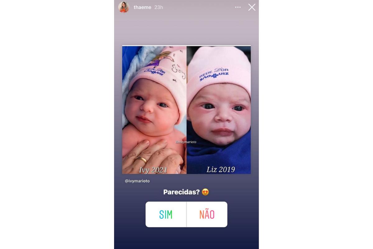 Thaeme compartilhou uma enquete no Stories do Instagram para perguntar aos seguidores se eles achavam as filhas delas parecidas. Ela colocou lado a lado uma foto de Liz quando nasceu em 2019 e uma foto de Ivy, que nasceu nesta semana. “Parecidas?” escreveu a cantora junto a uma enquete de “Sim / Não”