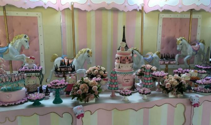 Decoração linda para a festa da Donatella, filha de Suzana Gullo e Marcos Mion, para comemorar seus 8 anos. O tema foi Hello Kitty em Paris