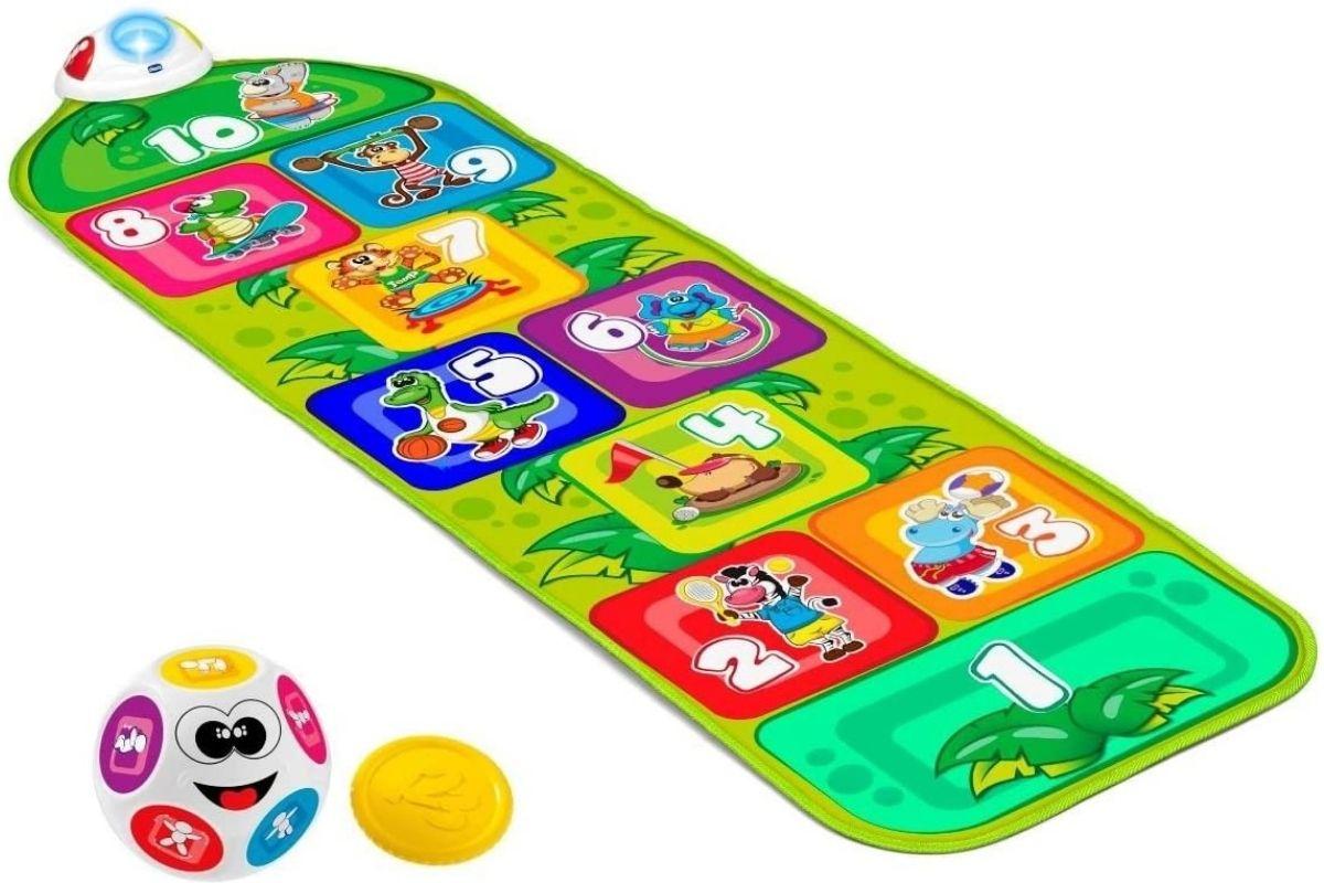 A amarelinha é uma brincadeira muito antiga e muito fácil de fazer em casa. Mas se você quiser incrementar, esse tapete é muito legal e pode ser uma boa opção de presente! Isso porque ela é interativa e emite luzes e sons. Além do jeito tradicional de brincar, também dá para jogar a bola e descobrir qual será o jeito mega divertido indicado pelo jogo. É só clicar AQUI para comprar no site da Amazon.