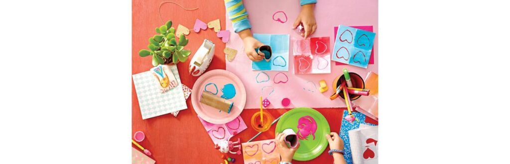 Em uma cartolina grande, trace de lápis linhas fracas separando a folha em quadrados. Junto com as crianças, escolha cores de tinta aquarela e pintem as divisões de tons diferentes. Deixe secar. Para fazer o carimbo usando o rolo de papel toalha, basta dobrá-lo em um dos lados de modo que fique com formato de coração. Molhe a ponta do tubo na tinta acrílica e marque os cartões.