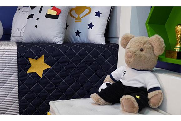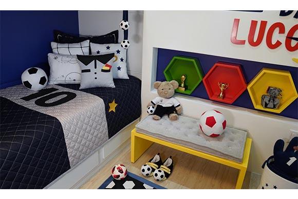 Bolas de pelúcia, ursos com bolas, pantufas de bola e muito mais! A temática esportiva está presente em todos os cantos do cômodo e é impossível não pensar em futebol ao olhar para o quarto. Um cantinho e tanto para estimular a criatividade de quem quer um quarto do esporte.