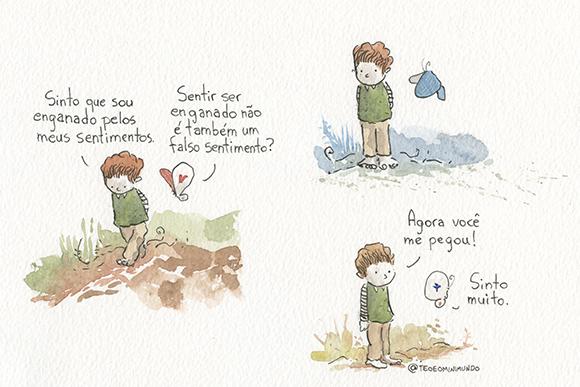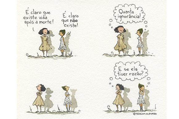 Os dois têm personalidades bem diferentes, os personagens costumam ter características que as pessoas se identificam. O Garfield, por exemplo, faz sucesso porque ele é preguiçoso e comilão. Charlie Brown é melancólico. Calvim é espevitado. Eu diria que o Téo é questionador. Já Eulália responde até onde vão os limites do conhecimento. Ela não responde tudo com exatidão. A busca da sabedoria é não conseguir encontrar a resposta fechada. É um ser mais maduro perto de uma criança. A personagem conversa com este menino que está em estágio de conhecimento. Mas apesar dele ser criança, também tem um lado adulto.
