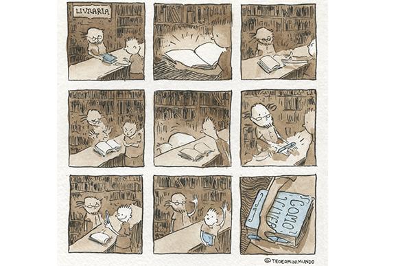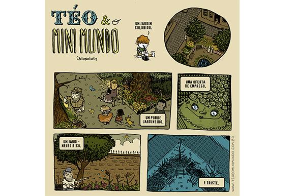 Surgiu da necessidade de ter um personagem que fosse uma linha comum entre várias histórias. Queria que fosse um eixo para a criação de histórias mais soltas. Uma linha comum entre todas elas. Fiquei imaginando alguém que observasse o mundo. Alguém que enxergava através de um microscópio. Na ilustração o mundo está dentro do microscópio do Téo.