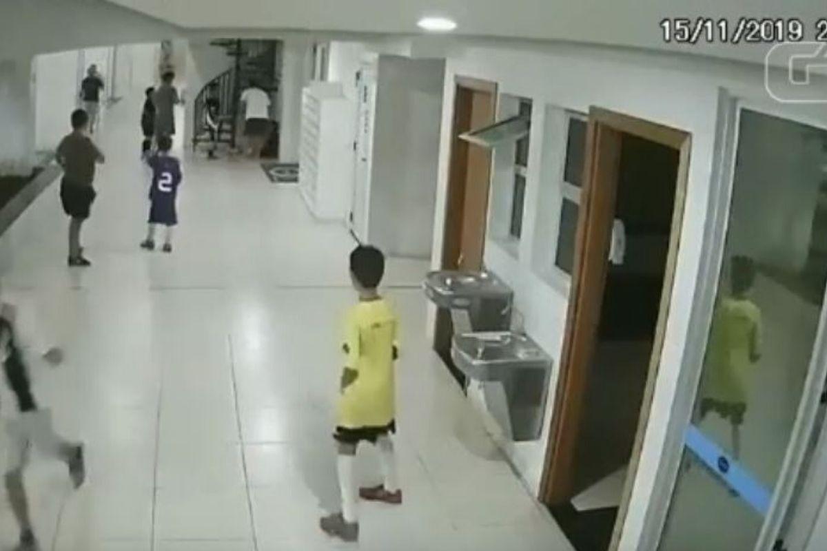 Em um vídeo, feito pelas câmeras de segurança do prédio, é possível ver as crianças trocando empurrões perto de um bebedouro. Um dos pais, que estava no momento da discussão, se envolveu e empurrou o menino de 11 anos conta a parede.