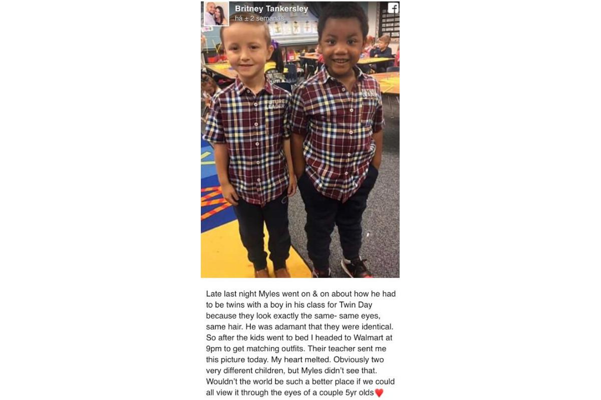 A publicação dos meninos vestidos iguais, encantou a internet. “Noite passada, o Myles não parava de falar que precisava se vestir como gêmeo com um garoto de sua sala para o Dia dos Gêmeos, porque eles eram iguais: mesmos olhos, mesmo cabelo. Ele estava convicto de que eram idênticos”, escreveu a mãe de Myles no Facebook.