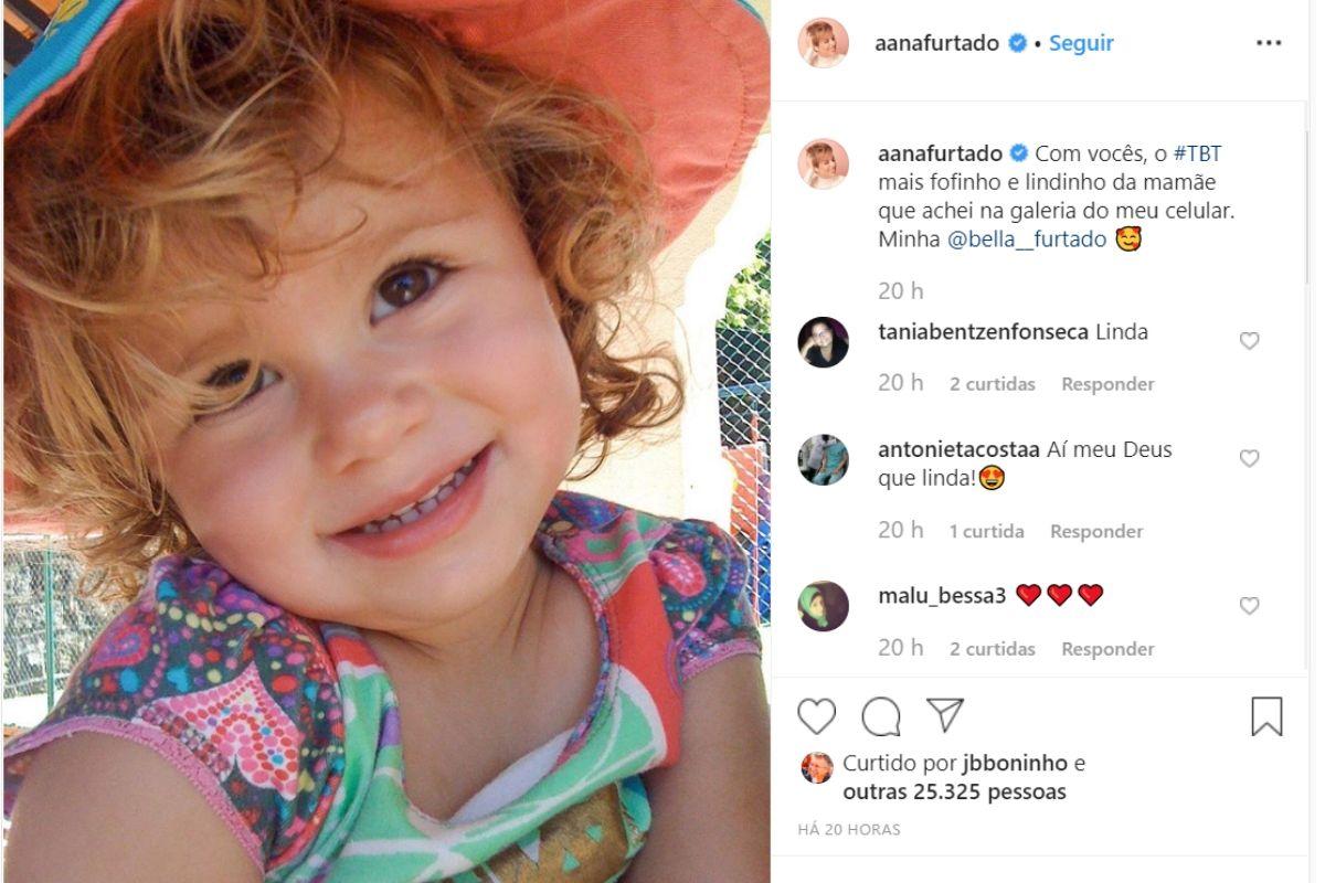“Com vocês, o #TBT mais fofinho e lindinho da mamãe que achei na galeria do meu celular. Minha @bella__furtado”, disse ela. E nos comentários, os fãs da família foram à loucura. “Aí meu Deus que linda!”, elogiou uma internauta. “Que bonequinha linda”, comentou outro seguidor. “Que gracinha! Agora já tá uma moça linda”, reparou mais outras internauta. A gente amou essa volta no tempo.
