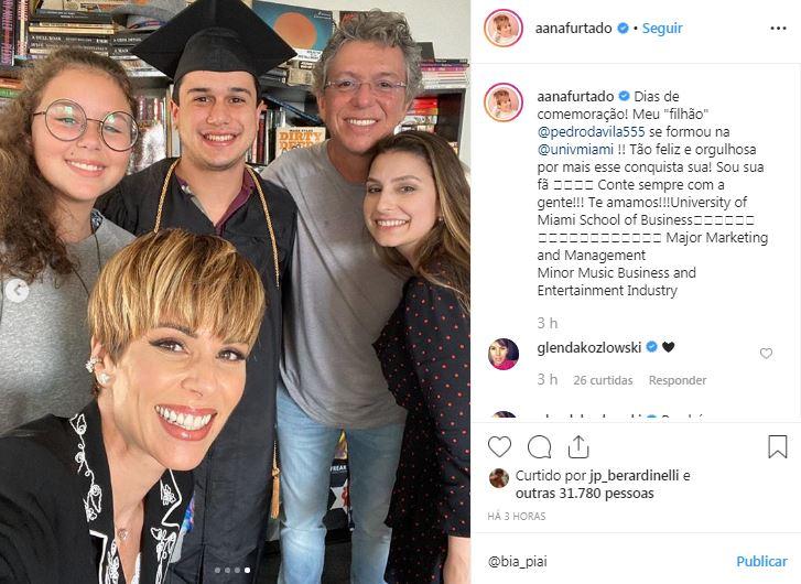 “Dia de comemoração! Meu ‘filhão’ Pedro se formou na University of Miami School of Business! Tão feliz e orgulhosa por mais essa conquista sua! Sou sua fã! Conte sempre com a gente, te amamos!”, escreveu Ana na legenda da publicação. Nas fotos, Pedro está ao lado da madrasta, do pai e da irmã Isabella, filha de Ana Furtado e Boninho.