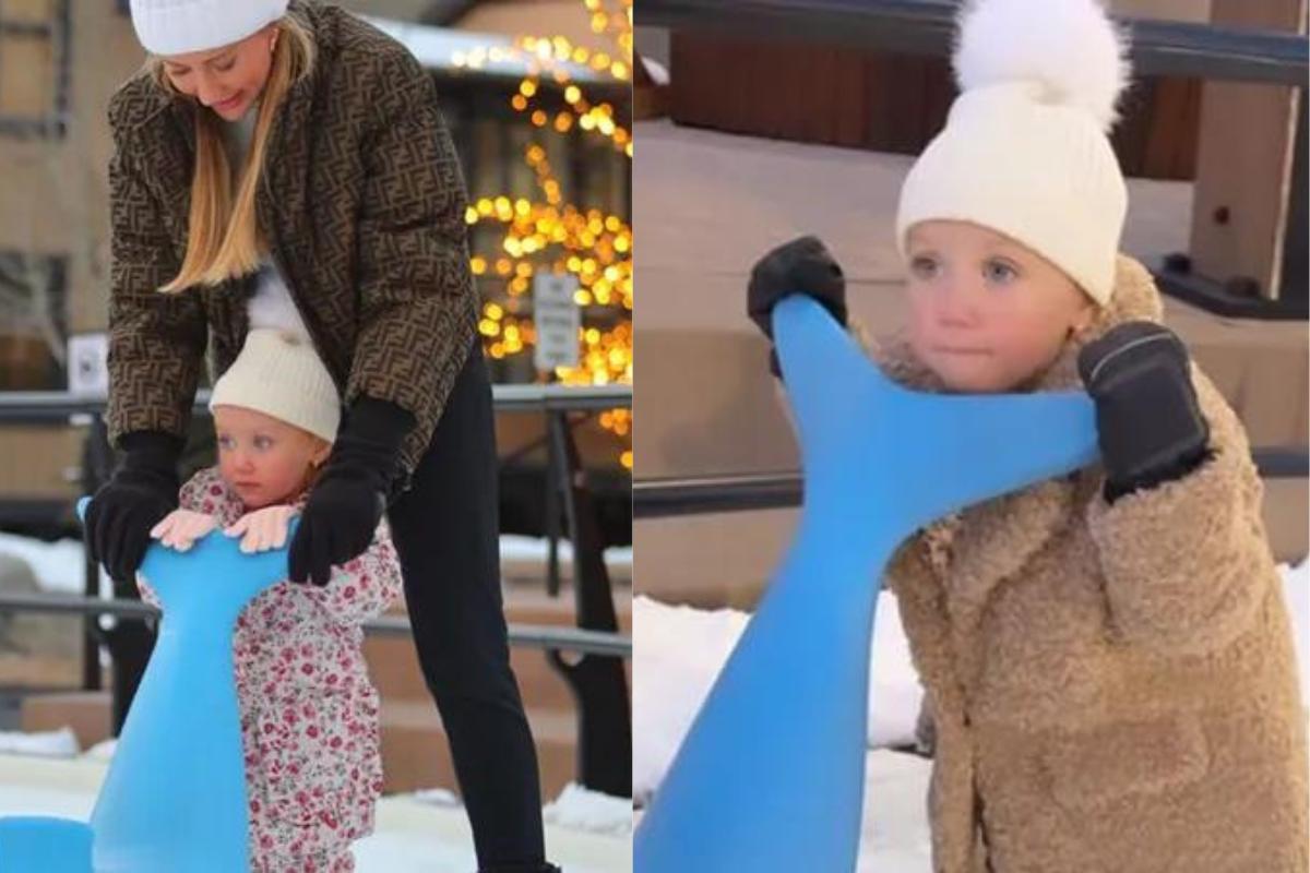 A menina apareceu curtindo uma patinação do gelo ao lado da mãe e com muita fofura se apoia em um objeto que a ajuda a patinar.