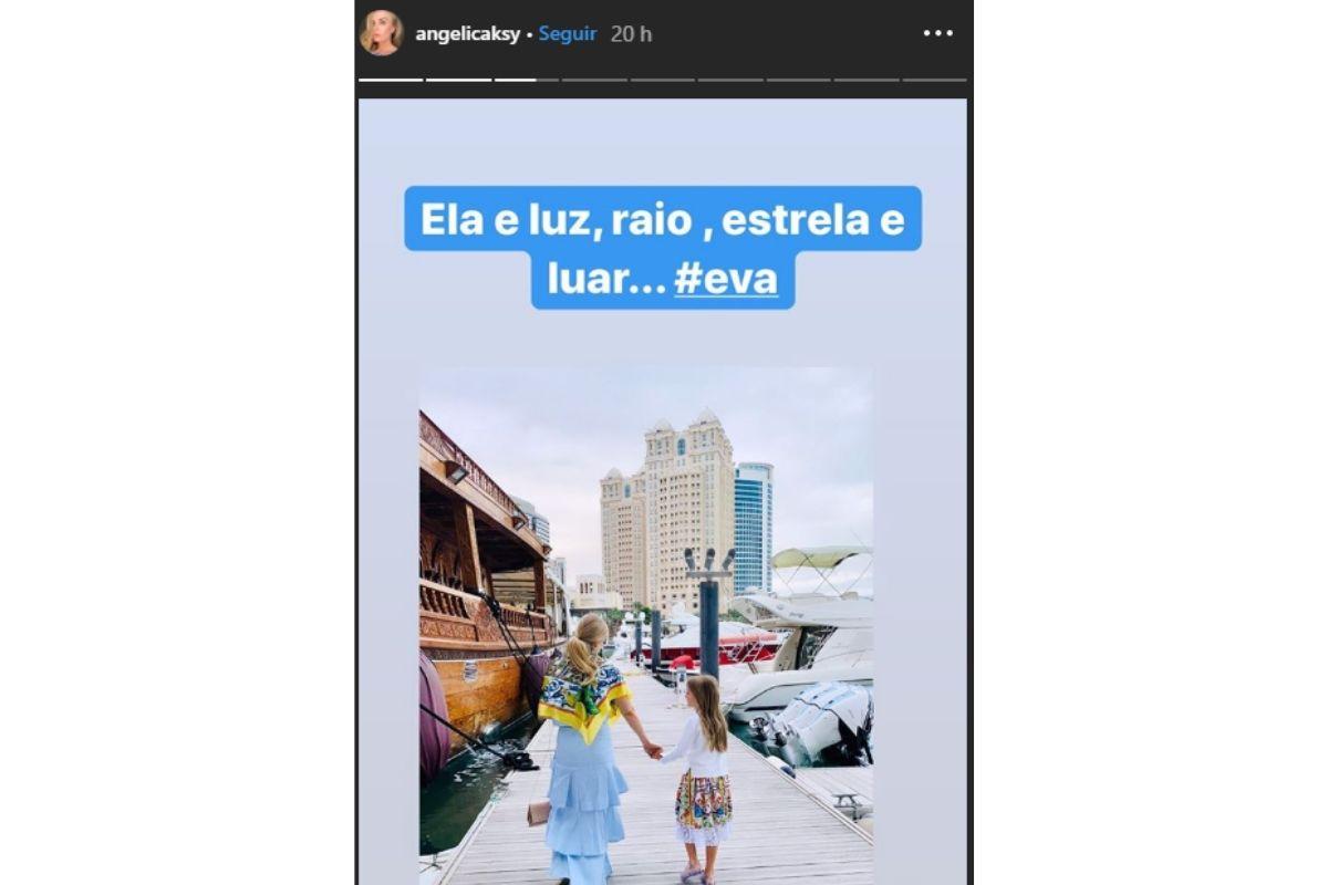As duas apareceram de mãos dadas andando em um pier no meio de barcos e se olhavam enquanto caminhavam. Como legenda da foto, Angélica escolheu uma letra de música bem famosa, mas que demonstra o que a Eva significa para ela. “Ela é luz, raio estrela e luar #eva”.