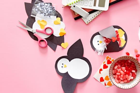 Desenhe um pinguim em uma cartolina preta, faça o centro do corpo em uma branca e junte com cola. Em papel amarelo, corte triângulos para os bicos e corações para os pés. Cole olhos de plástico no rosto, dobre as asas em volta de um saco de doces e feche com um adesivo – de coração, claro. Baixe o molde do Pinguim clicando aqui.