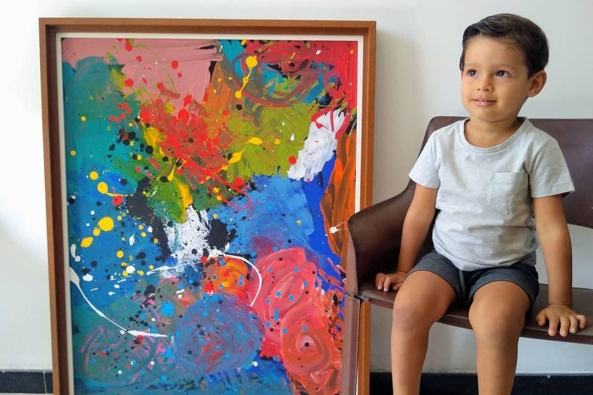 “A terapeuta ocupacional nos motivou a iniciar atividades com tinta de dedo no papel, pois ele não gostava de se sujar e deveríamos criar uma maneira de mudar esse cenário. Eu tentei algumas vezes e percebia que não fluía muito. Um dia, peguei um quadro velho, algumas tintas e pincel e o deixei interagir para perceber se ele iria se interessar mais.  Eu fiquei observando de longe e identifiquei uma relação diferente dele com a tela e logo percebi que ali havia uma potencialidade. Comecei a incorporar essa atividade como uma terapia, um momento meu e dele”, relata a mãe ao site Razões Para Acreditar.