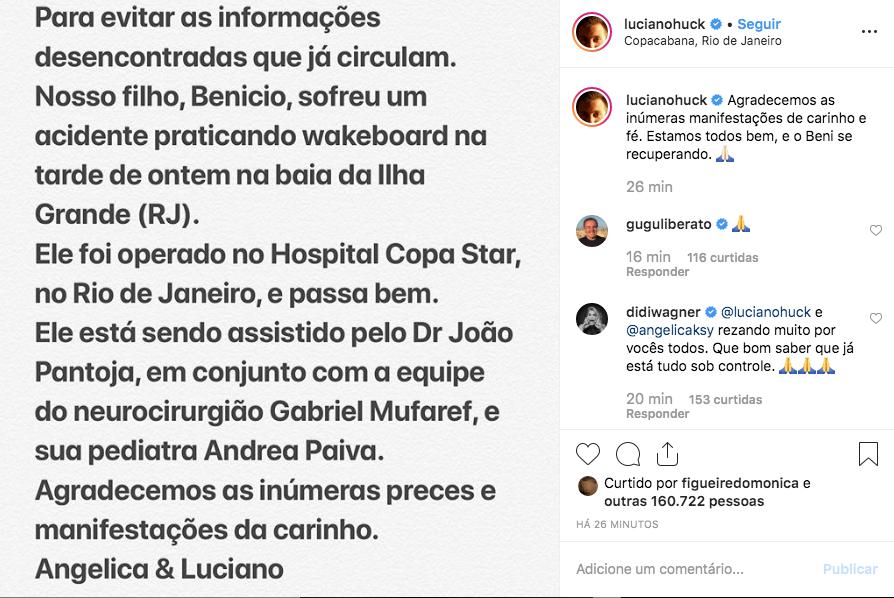 Luciano publicou uma nota no Instagram para acalmar os fãs dizendo que o filho foi operado, mas passa bem. “Para evitar as informações desencontradas que já circularam. Nosso filho, Benício, sofreu um acidente praticando wakeboard na tarde de ontem em Ilha Grande (RJ). Ele foi operado no Hospital Copa Star, e passa bem. Ele está sendo assistido pelo Dr João Pantoja, em conjunto com a equipe do neurocirurgião Gabriel Mufaref, e sua pediatra Andrea Paiva. Agradecemos as inúmeras preces e manifestações de carinho”, escreveu.
