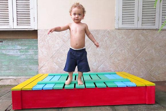 A caixa de areia mede 1,5m x 1m e é feita de madeira maciça tratada. A peça com pintura custa R$ 450, sem o frete (leva cerca de 10 dias para ser entregue).