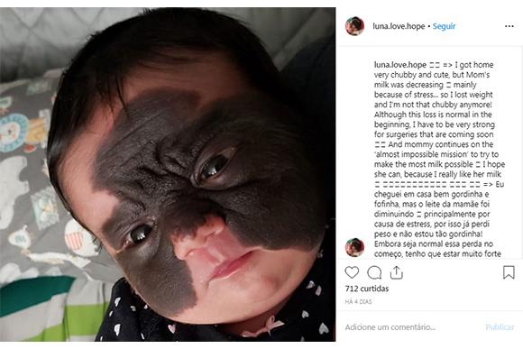 Carolina Fenner, mãe de Luna, mora nos Estados Unidos com a filha de quatro meses que sofre de uma condição rara chamada nevo melanocítico congênito. A menina, que nasceu na Flórida no início de março desse ano, nasceu com uma mancha escura que cobre grande parte do rosto e a mãe sofreu muito com algumas críticas preconceituosas que teve que enfrentar por conta da filha.