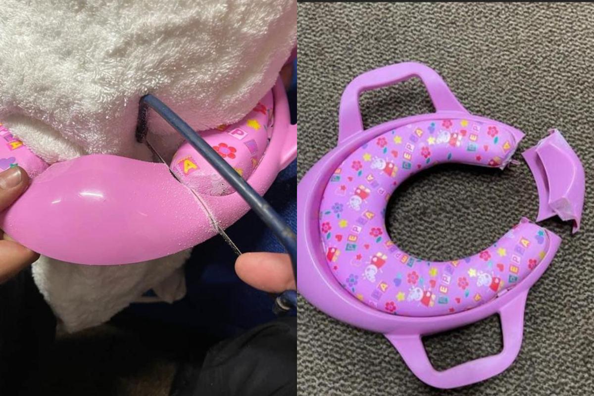 No sábado, 24 de julho, Izabell, de 3 anos, ficou com o pescoço preso em um assento sanitário infantil, com desenhos da personagem Peppa Pig. Os pais da menina não conseguiram tirar o objeto da filha e acionaram os bombeiros de Tauton, Inglaterra.