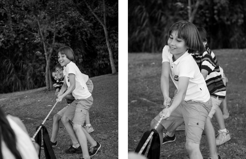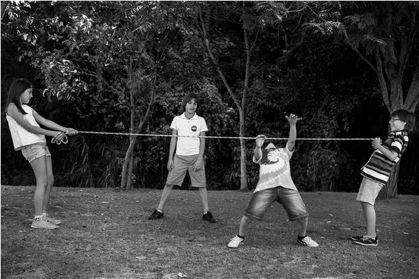As crianças se dividem em dois times e usam uma corda com uma fita amarrada no meio para puxar. Cada time puxa em uma direção, ganha o time que conseguir trazer a fita amarrada na corda para o seu lado do campo, que deve ser dividido em dois.