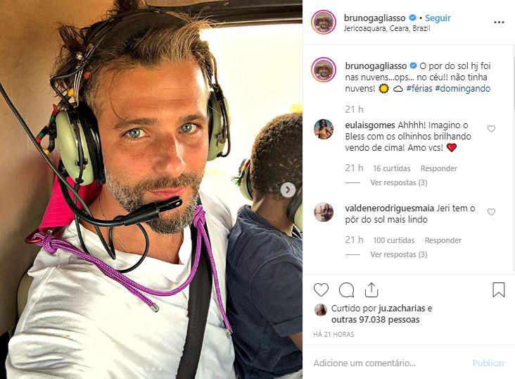 “O pôr do sol hoje foi nas nuvens… Ops… No céu! Não tinha nuvens”, disse o ator na legenda da publicação. Na foto, Bruno está segurando Bless no colo enquanto o menino olha a paisagem pela janela do helicóptero.