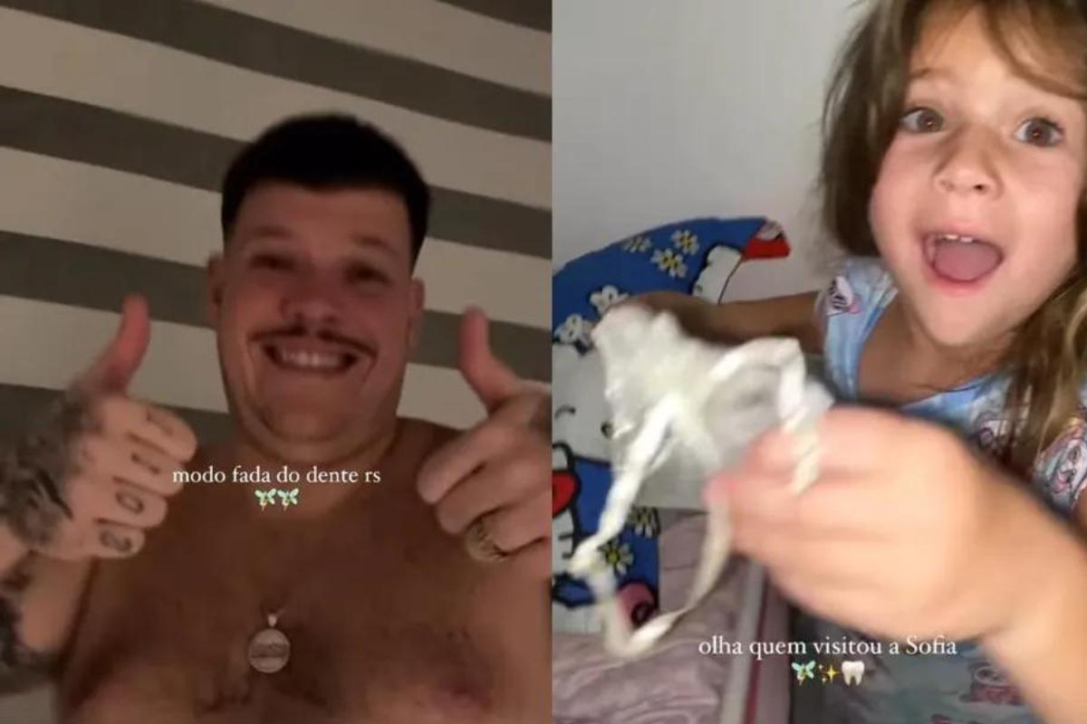 Na madrugada dessa quarta-feira, dia 1 de fevereiro, Ferrugem surpreendeu a filha de 5 anos de idade ao colocar moedas debaixo do travesseiro da menina, que tinha acabado de perder os dentes de leite. “Modo fada do dente”, escreveu a mulher do cantor de pagode, Thaís Vasconcellos, ao mostrar o pai no quarto da criança colocando as “recompensas”.