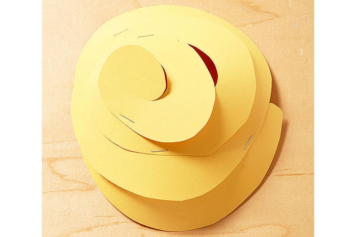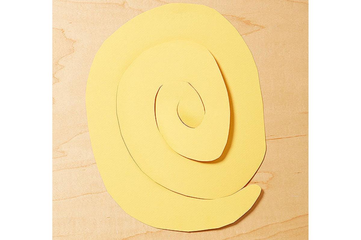 - Corte dez círculos de papel amarelo. Corte cada uma como se fosse uma espiral, começando pelo canto e indo até o centro.