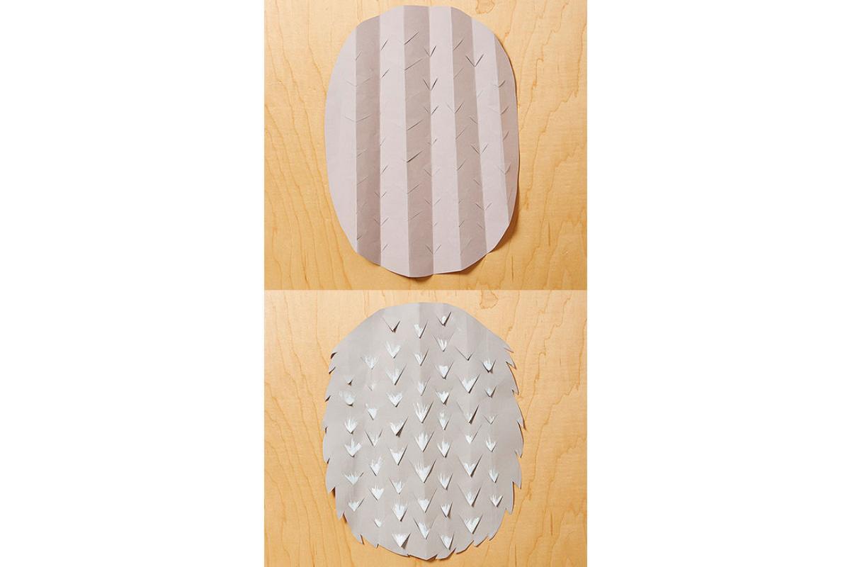 - Corte um pedaço do papel cinza em forma oval com cerca de 14 x 17 cm. Dobre o oval na largura em dobras.