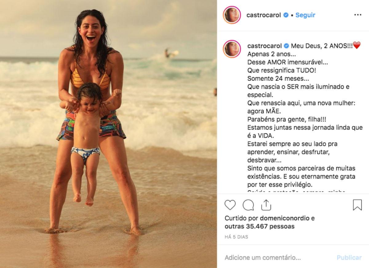 Carol Castro usou o Instagram, onde tem quase 3 milhões de seguidores, para parabenizar a filha Nina, fruto do relacionamento da atriz com o violinista Felipe Prazeres, pelo aniversário. A criança completou 2 anos no último dia 12 de agosto.