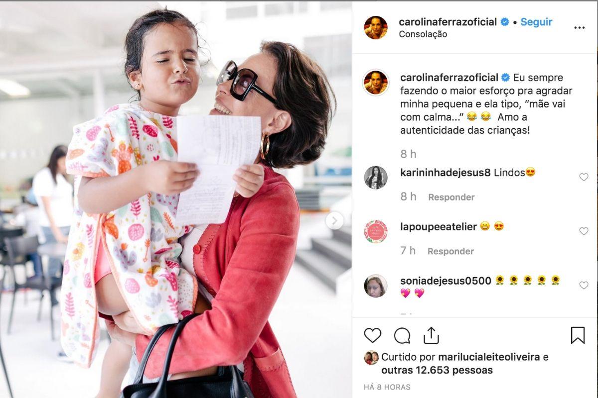 Em publicação, Isabel Marins, que tem 4 anos, aparece no colo da mãe e apesar da careta, ela está muito linda. “Eu sempre fazendo o maior esforço pra agradar minha pequena e ela tipo, “mãe vai com calma…” Amo a autenticidade das crianças!”, escreveu em legenda.