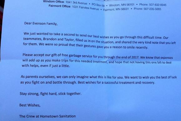 Por isso, a mãe das meninas decidiu enviar uma carta para a Hometown Sanitation Services, empresa em que os coletores trabalham. Ela queria explicar que as meninas não estariam mais em casa em todas as quintas-feira porque era o dia das seções de quimioterapia de Rose.