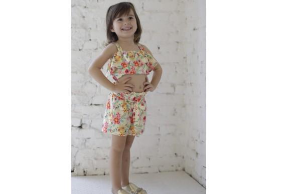 A irmã da atriz Bia Jordão desfilou com as peças da nova coleção e aproveitou para escolher um conjunto florido e alegre, com cropped e shorts de cintura alta. Assim como Lorena, ela optou por um tênis metálico.