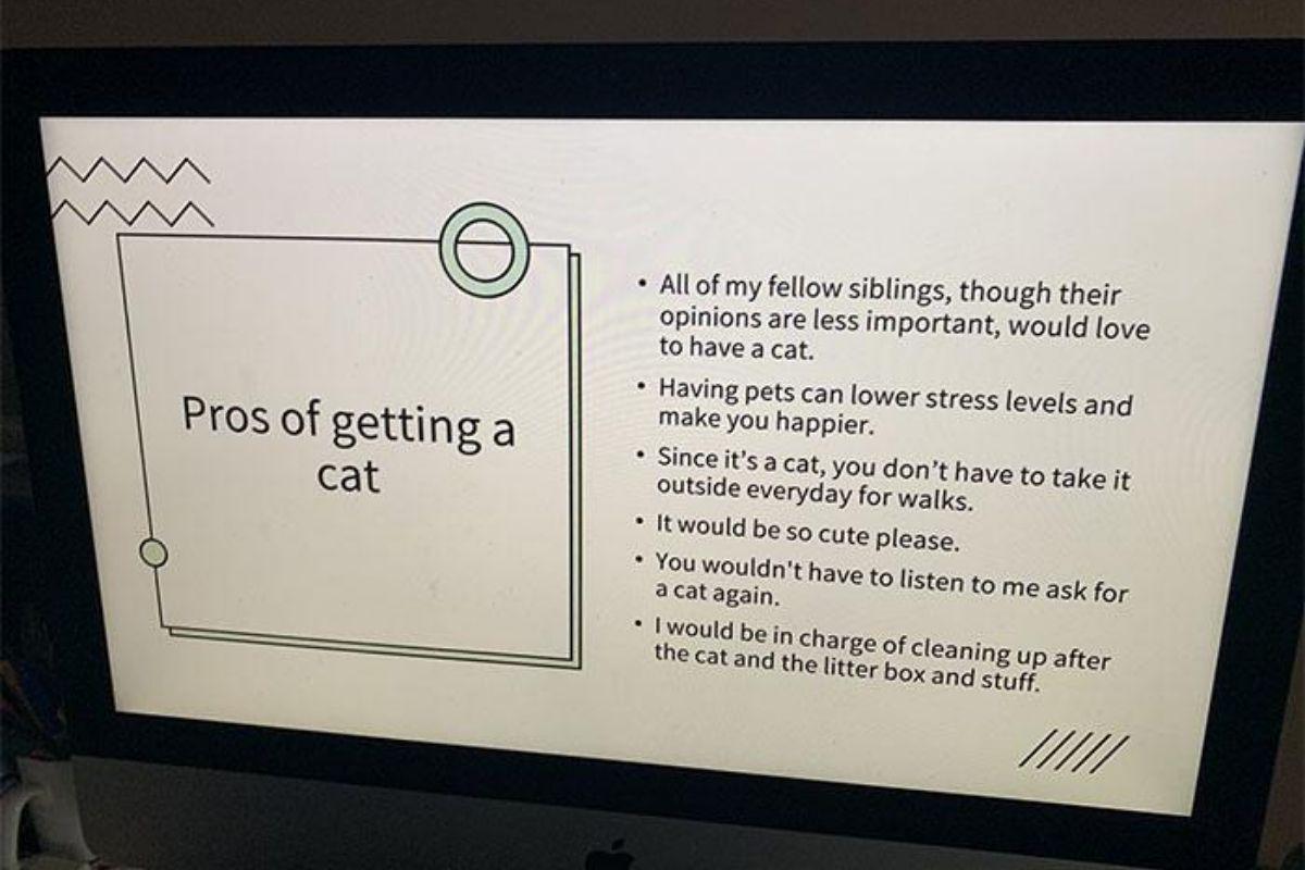 Em um dos slides, intitulado: “Prós de ter um gato”, a garota aponta que e “já que é um gato, você não precisa levá-lo para passear todos os dias”. Além disso, ela percebeu que teria que ajudar caso fossem realmente ter um gato e já prometeu que iria limpar a caixa de areia e contribuir para os cuidados do animal. Além disso, ela acrescentou que pesquisou tudo que precisa saber para ter um gato e jurou que não irá “negligenciar” suas obrigações.