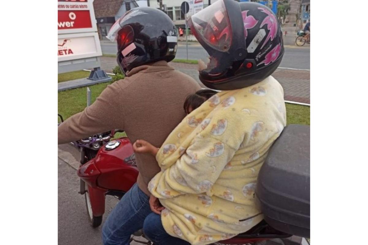 Um casal foi flagrado levando uma criança de apenas 3 anos em uma moto Honda CG, no final da tarde deste último domingo, 12 de setembro. A cena ocorreu por volta das 17h na região norte de Blumenau.