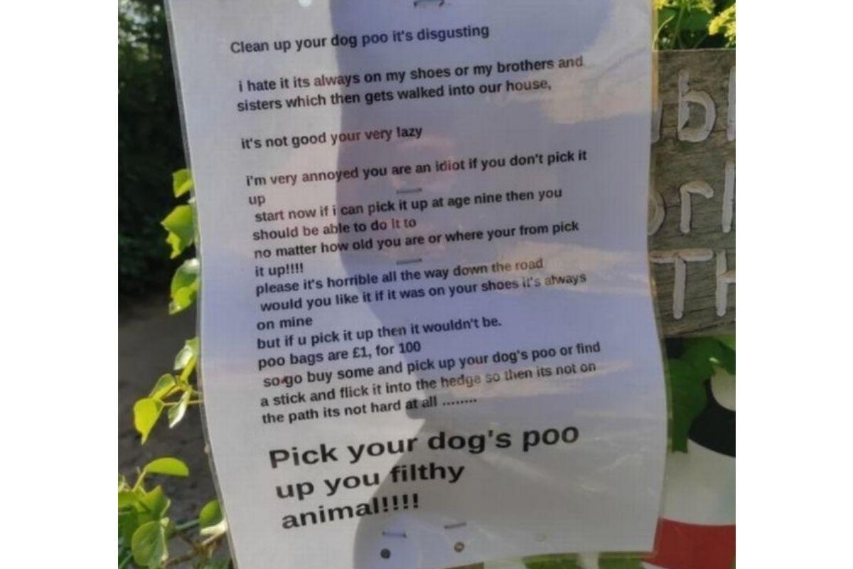 “Sacos para cocô de cachorro custam £1 o pacote com 100, então vá comprar e pegue o cocô do seu cachorro ou encontre um graveto e jogue-o na cerca viva para que não fique no caminho, não é nada difícil …”, completou, no recado que foi colado em um poste. “Pegue o cocô do seu cachorro, seu animal imundo!!”, adicionou outra pessoa, embaixo do recado.