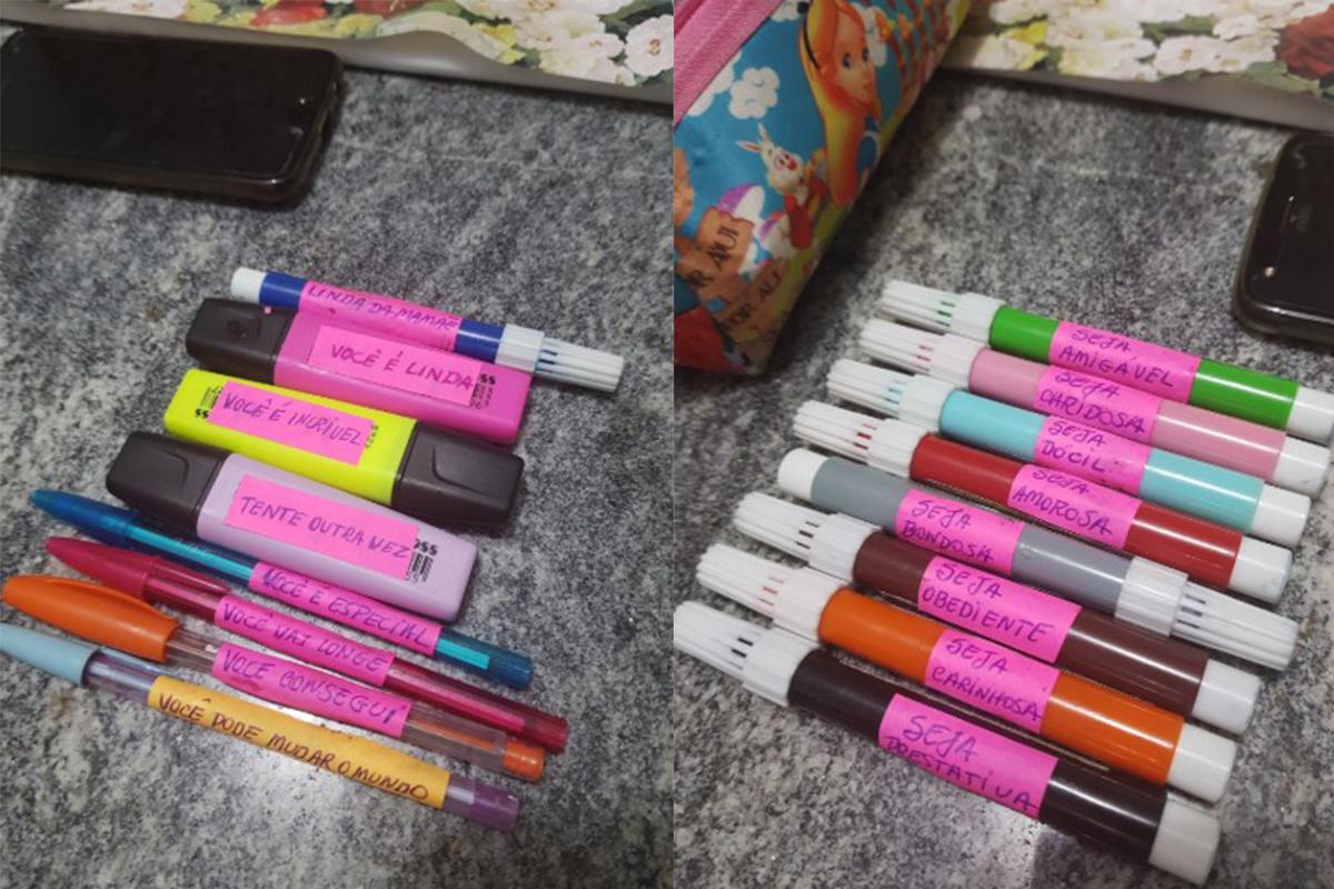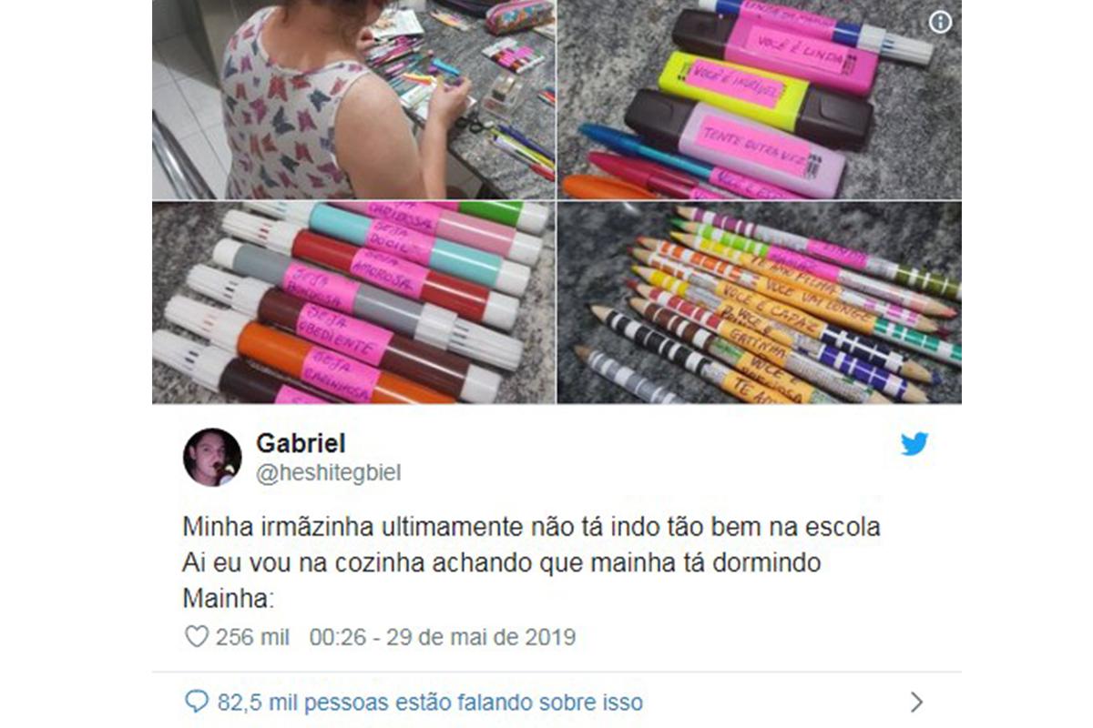No Twitter, Gabriel, irmão de Lili, compartilhou fotos da mãe etiquetando canetinhas e lápis da filha com frases motivacionais: “Tente outra vez”, “Você vai longe”, “Seja amigável” e “Seja caridosa”.