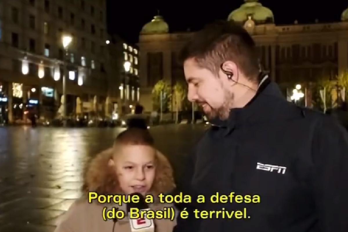 Na entrevista, o menino iniciou: “Eu acho que a Sérvia vai ganhar de 3 a 0 do Brasil porque Mitrovic vai marcar dois gols no início. No segundo tempo, Vlahovic vai marcar porque toda a defesa [do Brasil] é terrível e Neymar vai cair e chorar igual a um bebê”, relatou a criança enquanto conversava ao vivo no programa SportsCenter, da ESPN, durante a última terça-feira, 22 de novembro.