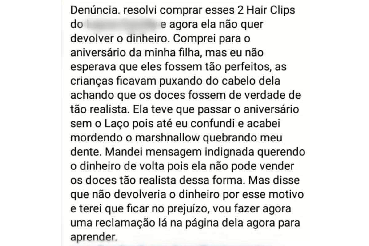 Nessa terça-feira (28), a mãe publicou uma reclamação em suas redes sociais contra a responsável de fazer e distribuir os enfeites de cabelo, Aline Ketline Mendes. A cliente confirmou a compra no valor de R$25,90, a qual foi encomendada através da rede social Facebook. A vendedora entregou os laços para Rosângela no Praiamar Shopping Center, em Santos (SP), após esta entregar R$30 e a empreendedora devolver seu troco.