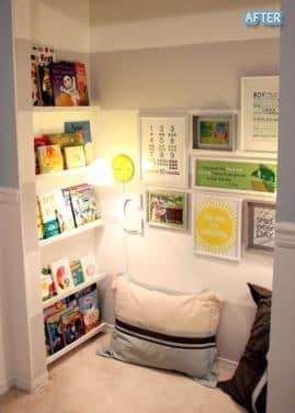 É só reservar um cantinho da casa, ou do quarto, deixá-lo alegre e colorido, e reunir ali os livros da criança, CDs de músicas e histórias, material para desenho e brinquedos. Mesinhas e cadeirinhas, um tapete gostoso e algumas almofadas já bastam para construir um lugarzinho aconchegante, que vai ajudar a criança a relacionar leitura e prazer. Na hora de compor esse espaço é interessante convidar a criança a participar.