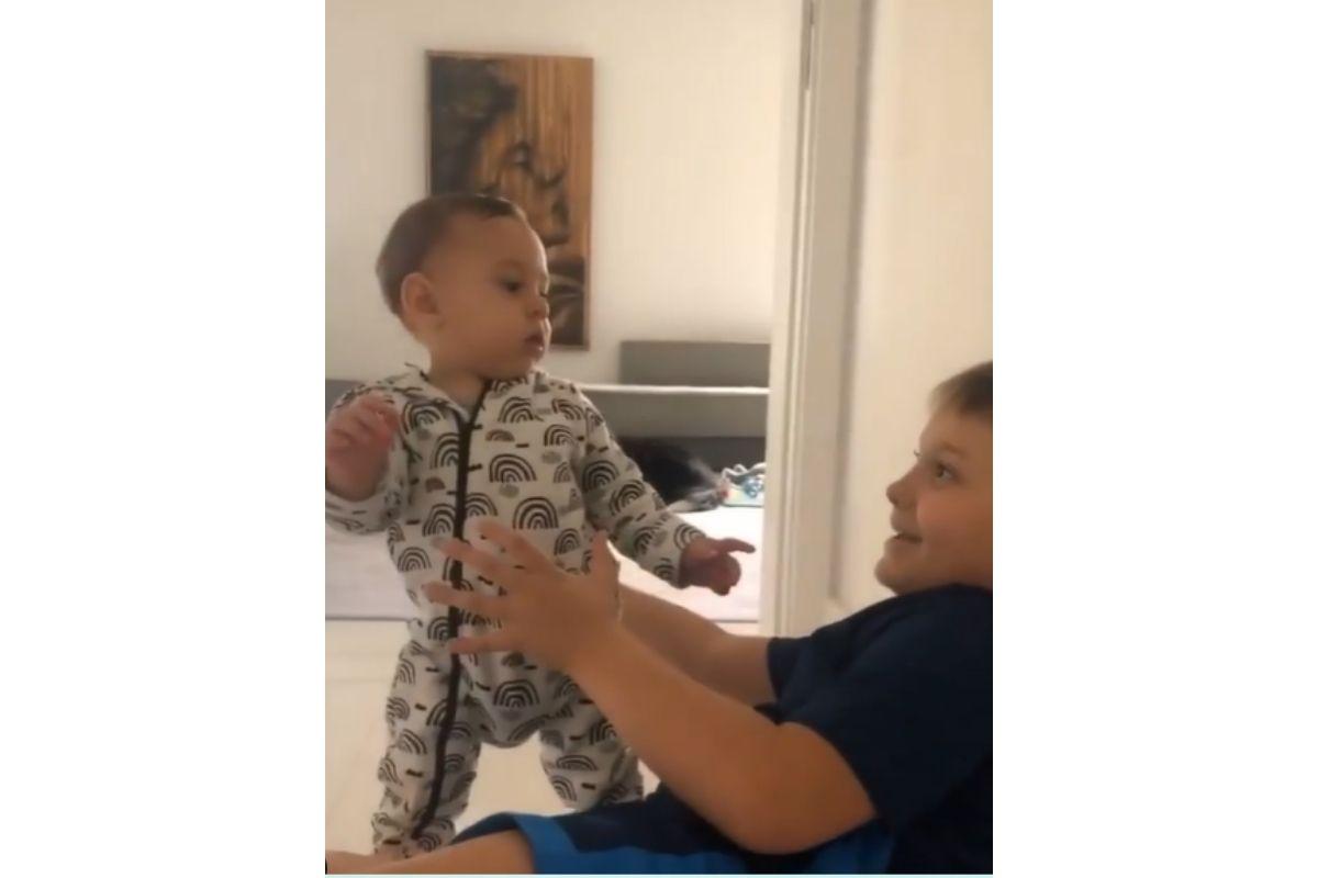Irmão que é irmão está presente em tudo! Quando viu Valentin ficar de pé pela primeira vez, Davi Lucca fez a maior festa a chamou a mãe para assistir o momento especial. Apoiado na perna do primogênito, o bebê se levantou sozinho em seguida, deixando a família toda orgulhosa.
