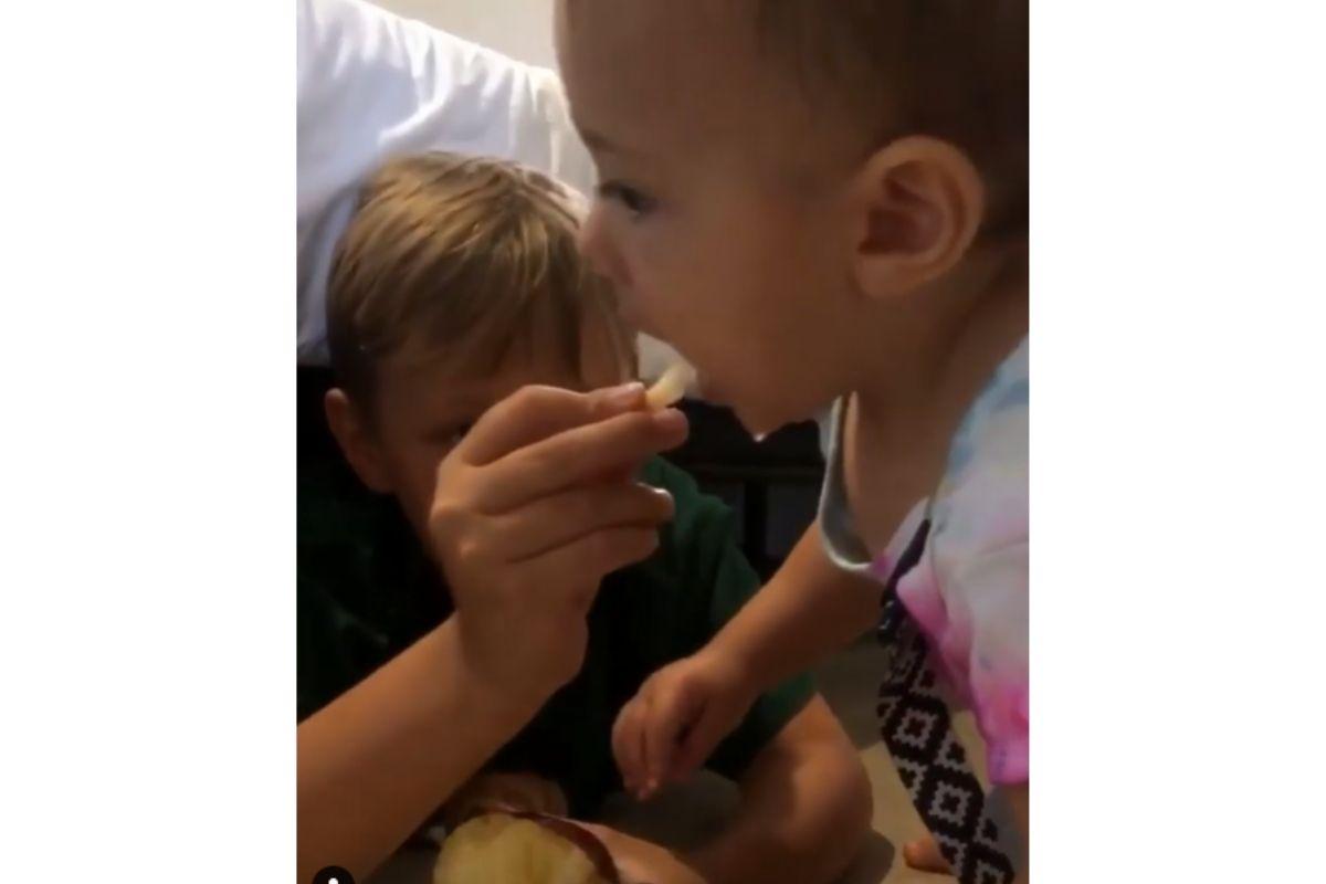 Tem que compartilhar! Em um momento único, o primogênito decidiu dividir uma maçã com Valentin, que claro, amou a ideia! Com o maior cuidado e paciência do mundo, Davi Lucca corta a fruta cuidadosamente e ainda checa se o pedaço está do tamanho ideal para o bebê. É muito amor!