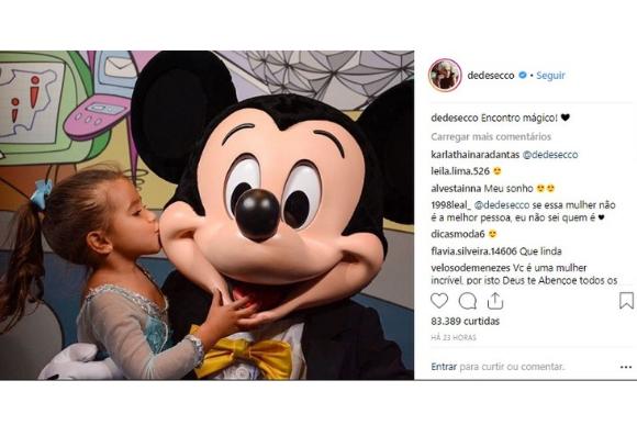 No último sábado, 09, Deborah postou em sua conta no Instagram uma foto de Maria Flor e o Mickey, personagem de Walt Disney. Na publicação, a menina aparece fantasiada de Elsa, uma personagem do filme Frozen, também da Disney.
